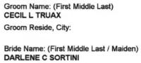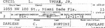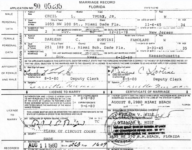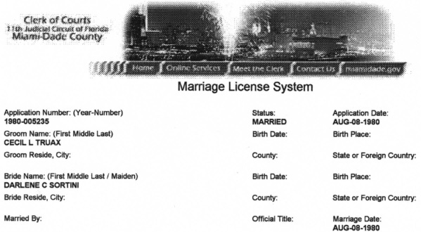 A clerk showed me another database, then inaccessible online, for Miami-Dade County marriage licenses. I got a hit on Cecil Truax: an application number for his 1980 marriage to Darlene C. Sortini.