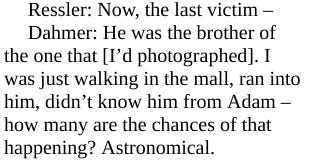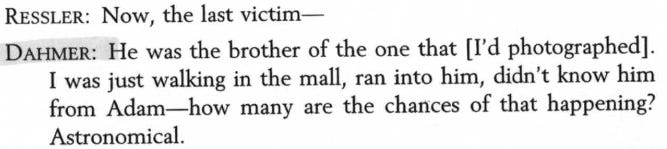 If there was anything relevant in the interview, I decided, I would buy the book. Reading it in the store, it was kind of a softball interview, mostly junk, Ressler didn’t challenge Dahmer at all. But there was one thing: