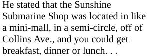 I went first to the Dade County main library’s Florida room, which had the 1981 Miami phone book on microfiche. It listed “Sunshine Sub – pizza,” at 17040 Collins Avenue.