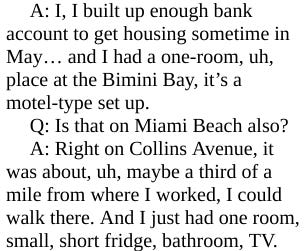 It was August 1992, and Hoffman was hoping that Dahmer would confess to killing Adam. The interview went an hour, covering 40 transcript pages, but it was largely over early when Dahmer denied the murder. The only thing he gave up was that while he was working he fraudulently collected unemployment insurance. Hoffman later checked that and found nothing. A year before, Hollywood had asked three other police departments if they had records of Dahmer: Miami, Miami Beach, and Metro-Dade had all said they had nothing. Nor had Hollywood.