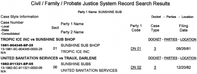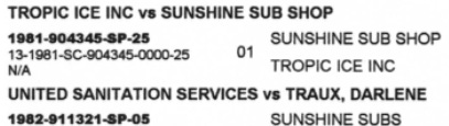 Sunshine Subs had three references, from 1979 to 1983. In a small claims action, as a defendant, appeared the name Darlene Traux.