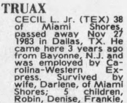 The next step was to search The Miami Herald, which by 2002 was electronically searchable by text at local public libraries back to mid-1982, when they’d computerized. I searched for “Cecil Truax” and got a one-line death listing on November 28, 1983. The database didn’t include paid death listings, so I manually searched the library’s Herald microfilm and found one, published the next day. Survivors listed were Darlene, five children, and his two sisters.