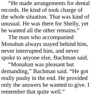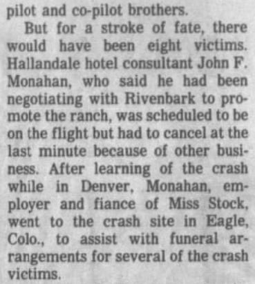 After the crash, apparently it was the widow of one of the pilots who tipped the Fort Lauderdale News and Sun-Sentinel that the plane and Rivenbark were connected to someone significant in the Walsh story: John Monahan, John Walsh’s mentor, longtime close friend, kind of daddy, and at the time working in an office across the hall from where Walsh worked.