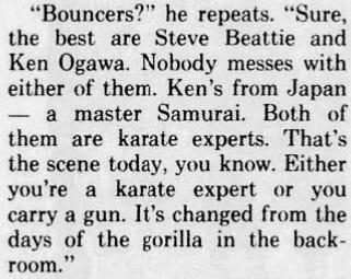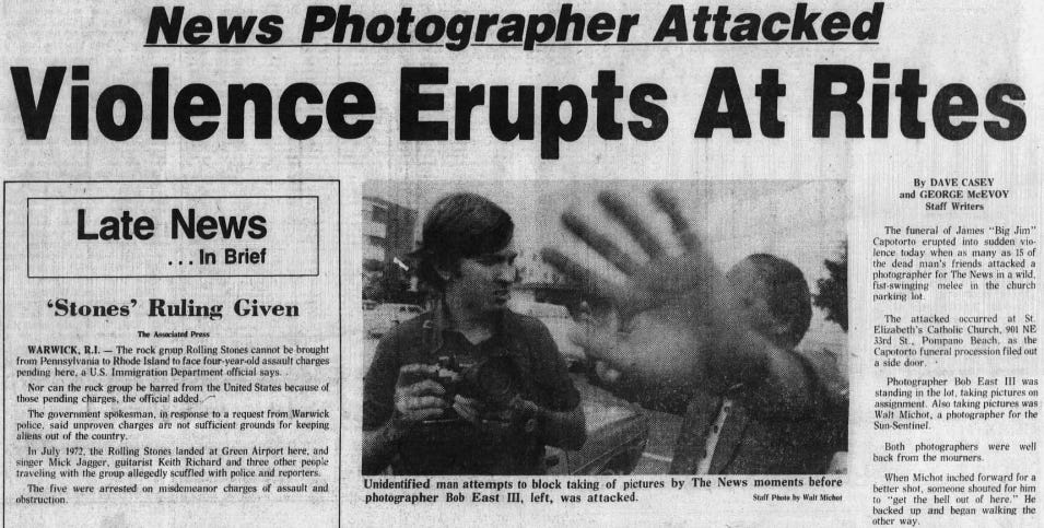 In 1976, Camperlengo’s club manager, Mickey Rauso, was charged with felony criminal mischief and battery on Fort Lauderdale News photographer Bob East, assigned to shoot pictures outside a Catholic church service before a funeral of another bouncer, who might have qualified for the “toughest men” story had months before it ran he hadn’t been killed. After mass, someone told East to “get the hell out of here,” although other news photographers and reporters were present and they’d all kept their distance.