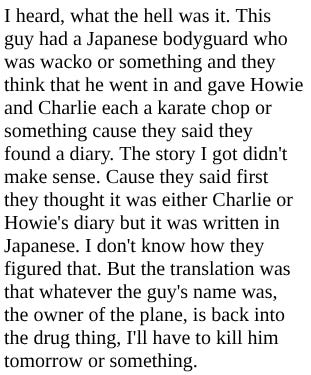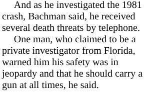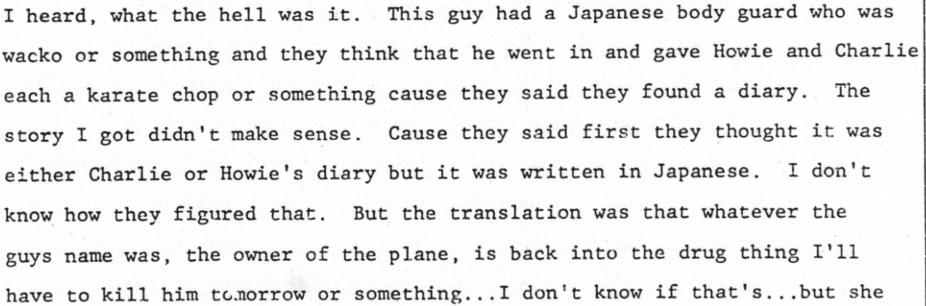 Back to Ogawa: a diary written in Japanese was found at the crash site, and the State Department had it translated. Lou Kilzer, a reporter then on The Denver Post, told me he got a copy. In it, Ogawa wrote that he was working for the American Mafia, using the word “Mafia,” and that he thought that his boss, Rivenbark, should die.