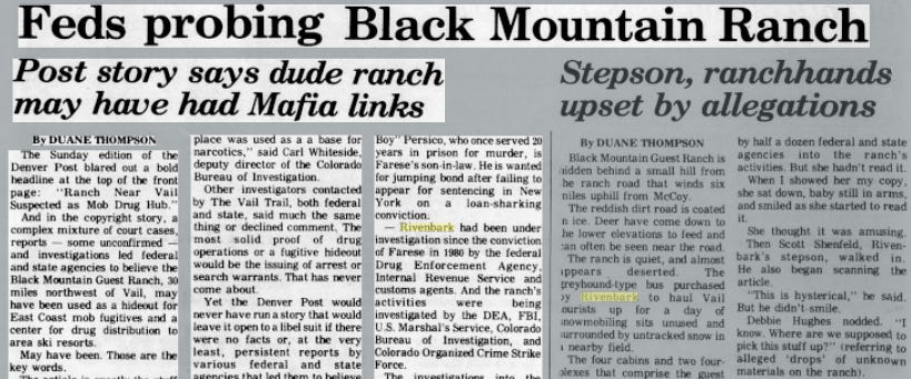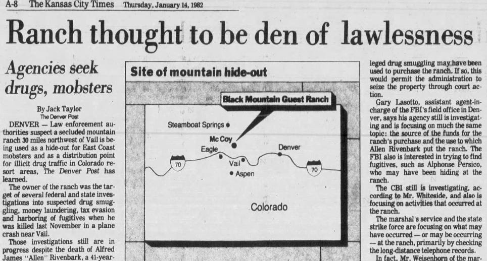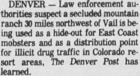 Two months later, on January 10, 1982, The Denver Post bannered a story, “Ranch Near Vail Suspected as Mob Drug Hub.” It was reprinted elsewhere: