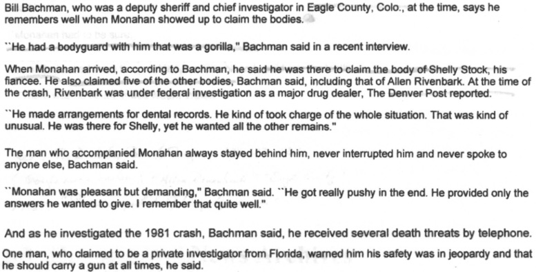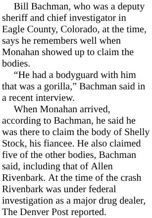 Had Steve flown to Denver with Monahan? Was he Monahan’s gorilla? Was Steve, like Monahan, supposed to be on the downed plane?