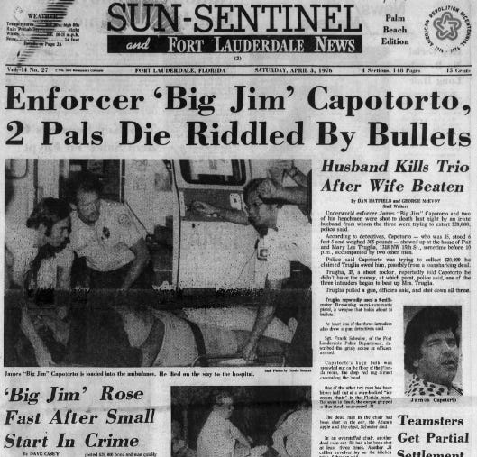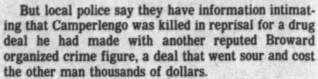 The funeral was for 6-foot-5, 305 pound James Capotorto, who was then under federal indictment along with Camperlengo and others for importing pot. The Miami Herald reported that the FBI said Capotorto’s ring specialized in kidnapping, extortion, and robbery of drug dealers.