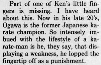 The Herald reporter didn’t pick up on this, but the self-cutting of a portion of a finger is a hallmark of members of the Japanese Yakuza, done for reasons of penance and deference. It virtually labeled Ogawa as a member of an organized crime group.